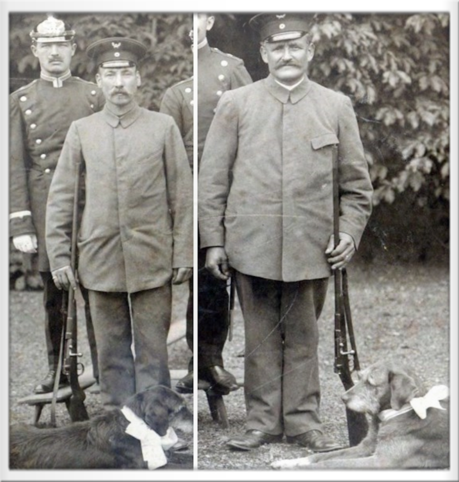Zwei Feldhüter mit ihren Hunden und einem Karabiner um 1914