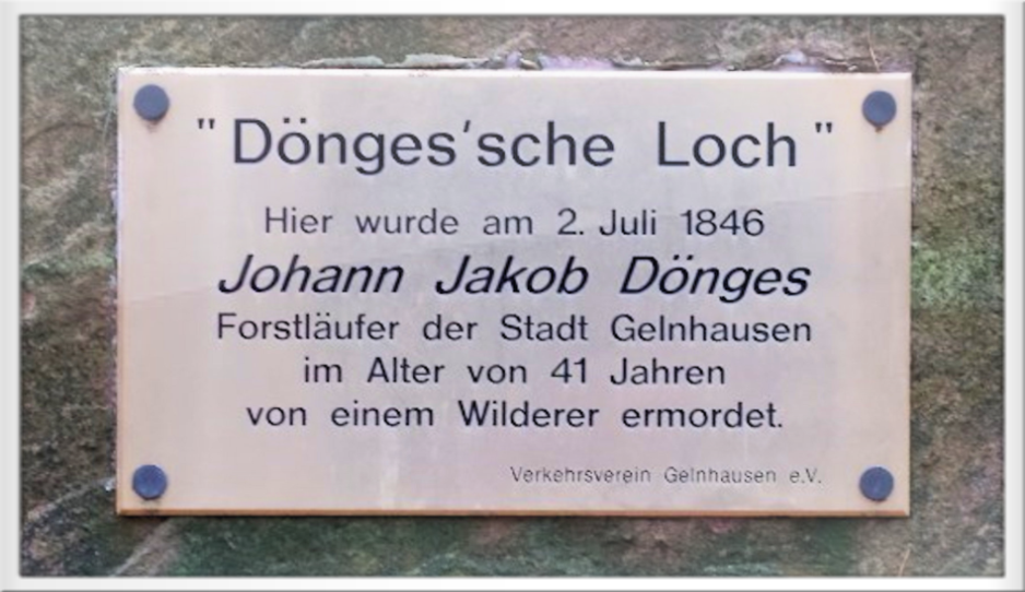 Erinnerungsplakette im Gelnhäuser Stadtwald an den 41 jährigen Forstläufer Johann Jakob Dönges, der auf seinem Inspektionsgang einen Wilderer überraschte, dieser hat ihn vermutlich getötet. Auf seinem Grabstein steht: Hier ruht in Gott Johann Jakob Dönges, Forstläufer, geboren am 25.7.1804, gestorben durch Mörderhand am 2.7.1846.