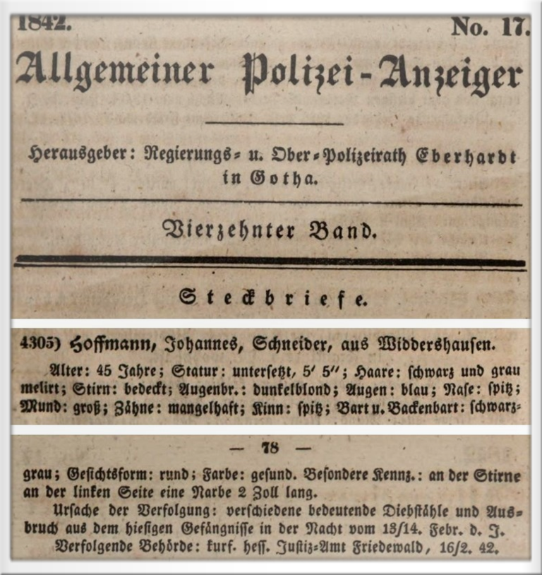 Steckbrief über den Schneider Johannes Hoffmann (1796-1854) aus Widdershausen wegen mehreren bedeutenden Diebstählen und Ausbruch aus dem Gefängnis in Friedewald am 14. Februar 1842.