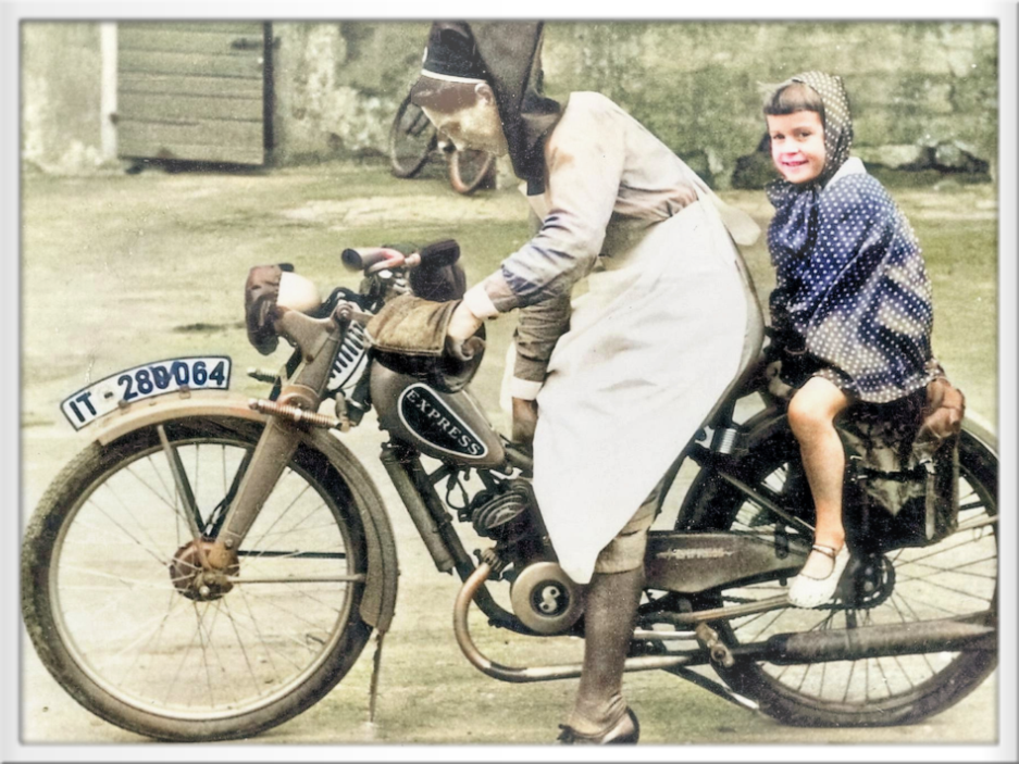 Schwester Toni Köhler auf ihrem Dienstmotorrad 1941 mit Nichte Sonja in Biebergemünd, hier war sie von 1935 bis 1948 als Gemeindeschwester tätig.
