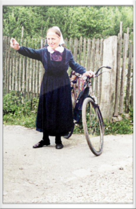 Diakonisse mit dem Rad in der Hand, bei der Begrüßung eines Dorfbewohners und vielleicht der Beginn eines Gespräches unterwegs