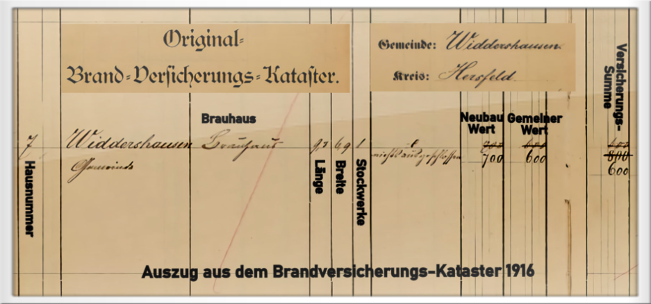 Auszug aus dem Gemeinde Brandkataster Widdershausen von 1916, hier wird das Gemeinde-Brauhaus mit Maßen und Versicherungswert aufgeführt