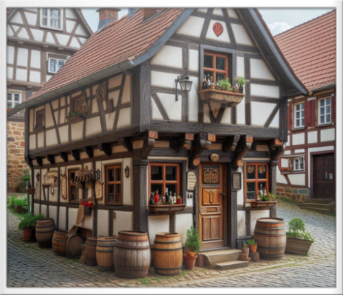 Aussenansicht eines kleinen Gemeinde-Brauhauses in einem Dorf des 19. Jahrhunderts (KI-generiert)