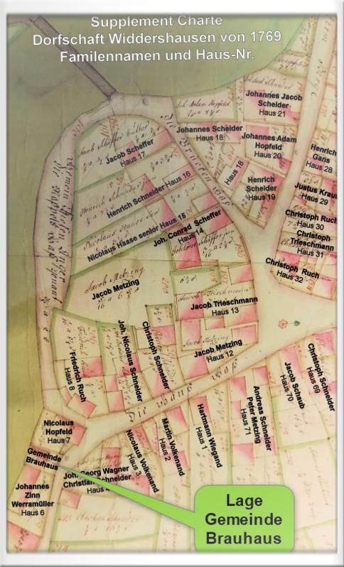 Lage des Gemeinde-Brauhauses in der Ortsübersicht des alten Dorfes in einer Karte von Widdershausen aus 1769