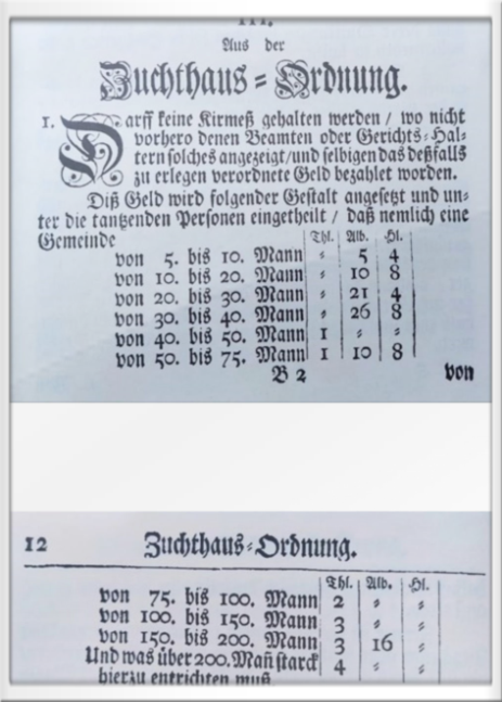 Kapitel III der Grebenordnung von 1739 - hier werden die Kosten für die Abhaltung der Kirmes aufgeführt, die Kosten sind von der Anzahl der Teilnehmer abhängig. Die Kirmesabhaltung muss den Beamten oder den Gerichtshaltern angezeigt werden.