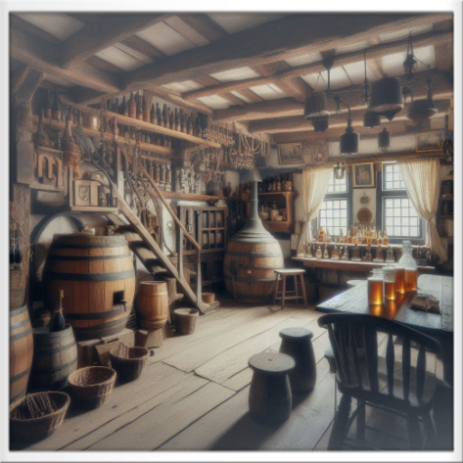 Innenansicht eines kleinen Gemeinde-Brauhauses in einem Dorf des 19. Jahrhunderts (KI-generiert)