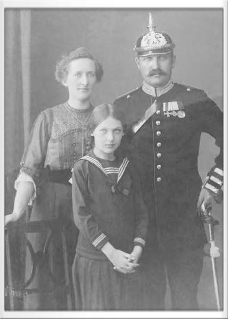 Familienfoto mit Gendarm der Großherzoglichen Gendamerie im dunkelgrünen Rock mit weißen Knöpfen und karmesinroten Aufschlägen mit 3 silbernen Litzen.