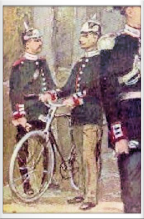 Gendarmen des Großherzoglich Hessischen Gendarmeriekorps 1902. Dunkelgrüner Waffenrock, dunkelblaue Beinkleider, im Sommer grau.