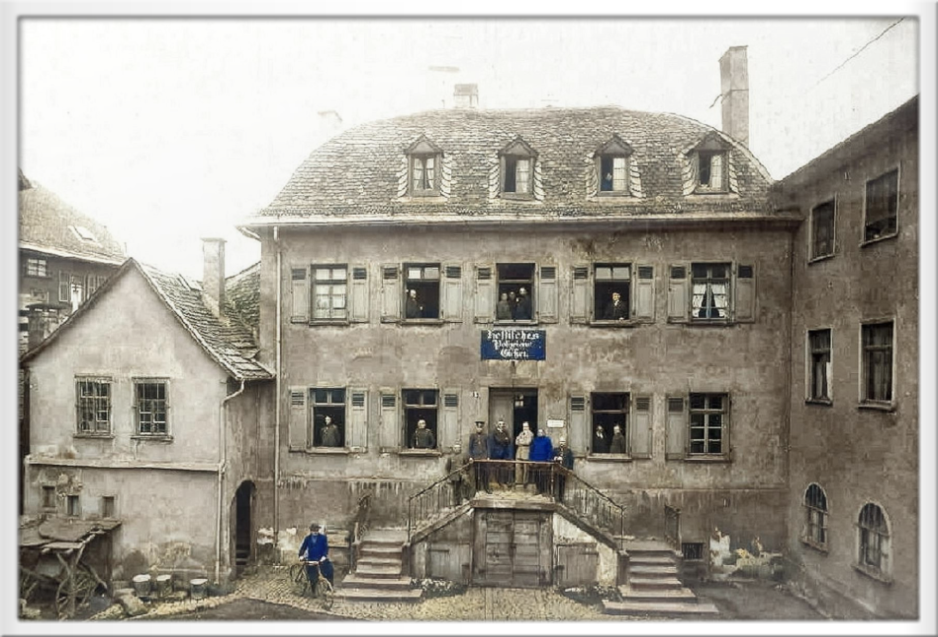 Aufnahme aus der Gastwirtschaft Johann Georg Schäfer um 1900 in der Brückengasse in Widdershausen, zweiter von links Fußwachtmeister Homann aus Friedewald, rechts ein Baumeister der am Bau der Zentrale in Widdershausen gearbeitet hat