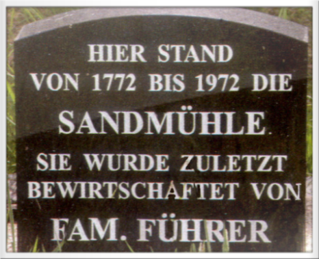 Gedenkstein der Familie Führer am ehemaligen Standort der historischen Sandmühle