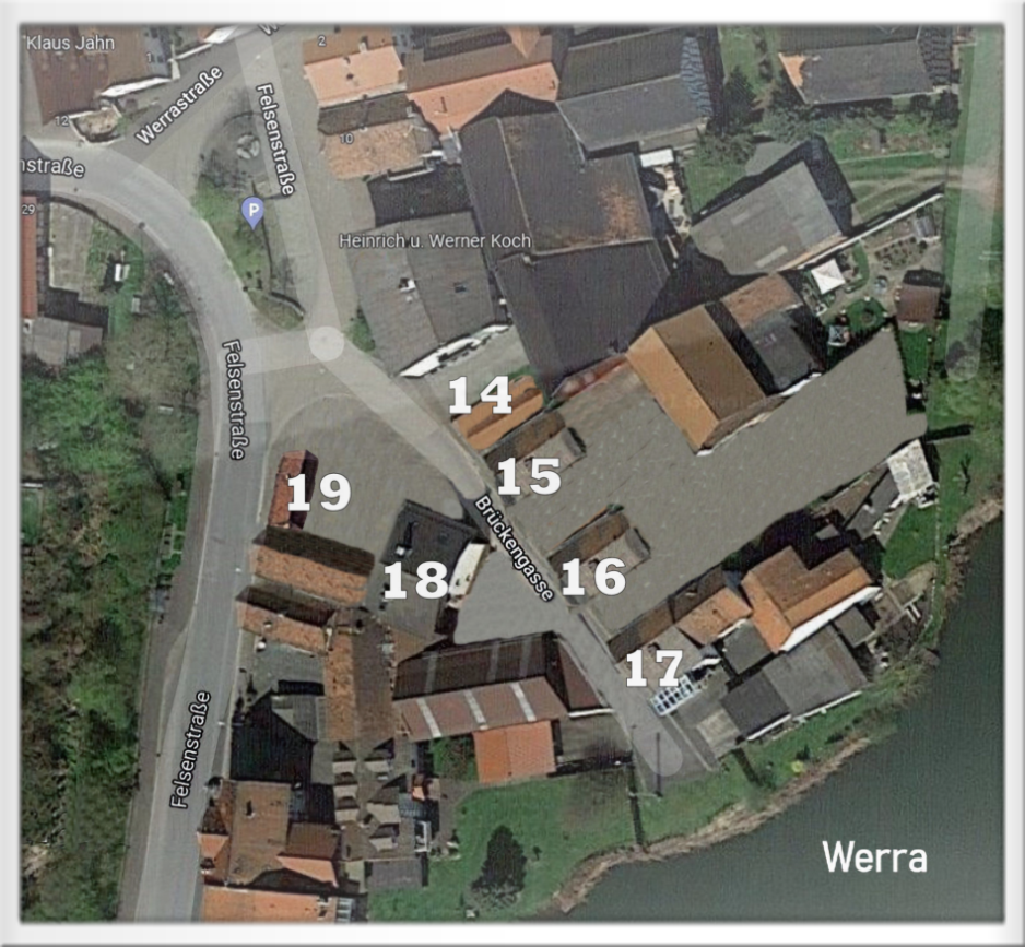 Es geht weiter mit Brückengässers (Trieschmann) mit der 15, dann die Nummer 16, heute Mellahms Garten, früher stand hier das Haus von Heinrich Schneider. Die Nummer 17 gehört Koulahns (Mötzing) an der Werra. Dann geht es die Brückengasse auf der anderen Strassenseite wieder Richtung Linde mit der Nummer 18 dem Haus von Gardisten (Schäfer/Österreicher).