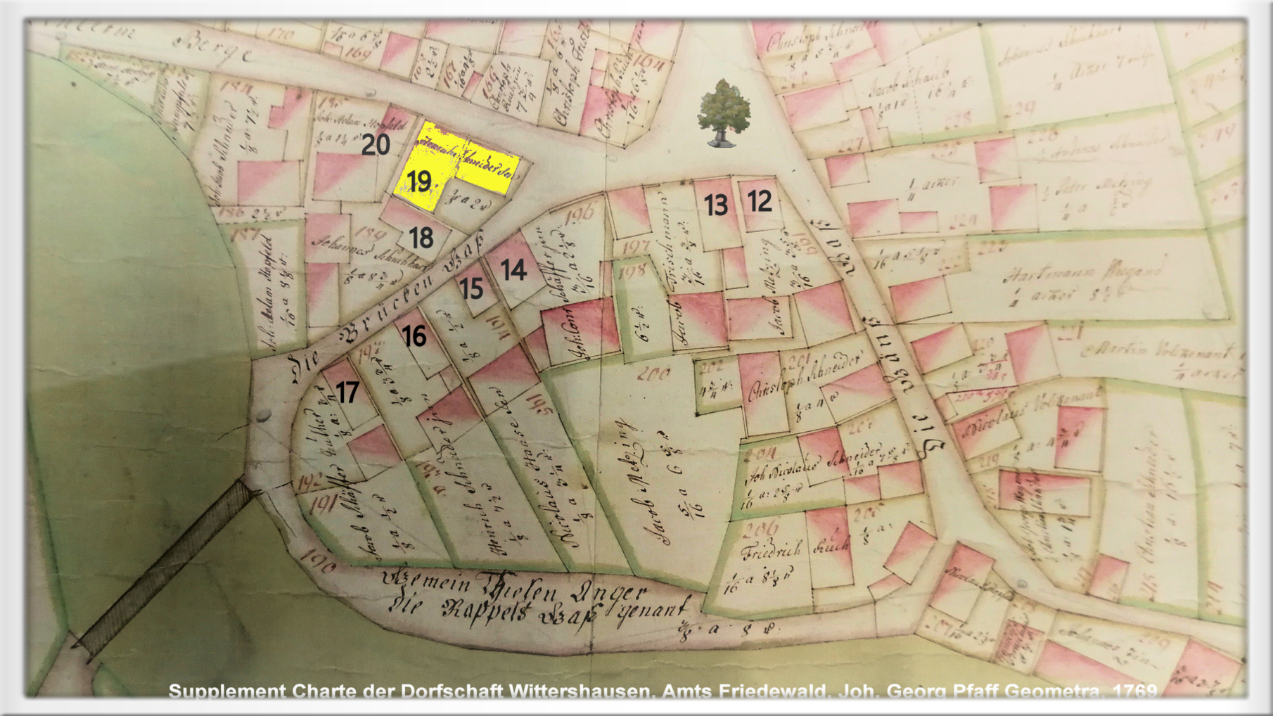 Das Haus 19 haben wir erst auf der Supplement-Karte von 1769 im Staatsarchiv Marburg gefunden, auf der Katasterkarte von 1850 war nur die Scheune eingezeichnet, die schon seit langer Zeit zum Haus 18 gehört.