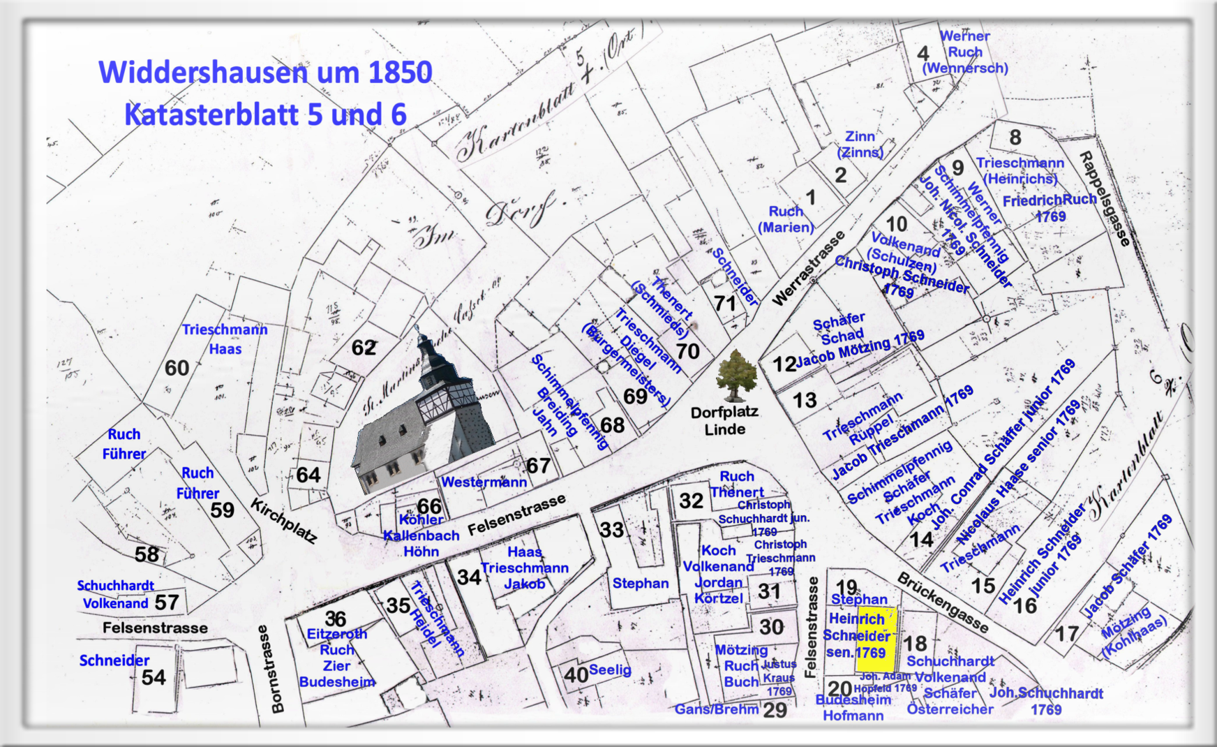 In der Supplement Karte der Dorfschaft Widdershausen aus dem Jahre 1769 ist das Haus 19 mit Scheune und Wohnhaus eingezeichnet, als Besitzer ist hier Heinrich Schneider eingetragen.