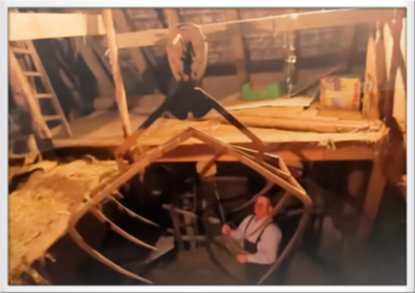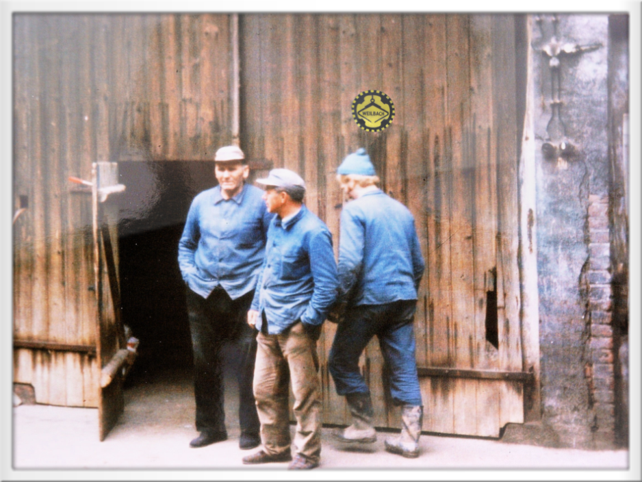 Heinrich Koch, Erich Mötzing und Werner Koch vor dem Scheunentor in der Brückengasse in Widdershausen. Am Scheunentor das Logo der Josef Weilbach Spezialfabrik für Heu- und Getreideaufzüge. Dieses Blechschild zeigt an, dass in dieser Scheune ein Weilbach-Aufzug installiert ist.