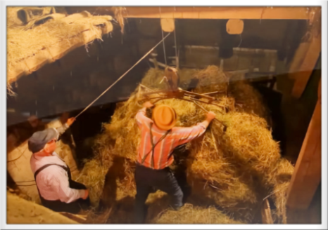 Der Heu-Greifer wird auf dem Erntewagen in Empfang genommen und mit einer neuen Last versehen