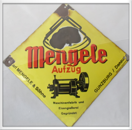 Blech-Reklame Schild der Firma Mengele aus Günzburg für Greiferaufzüge