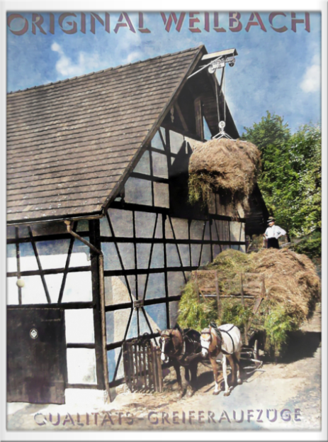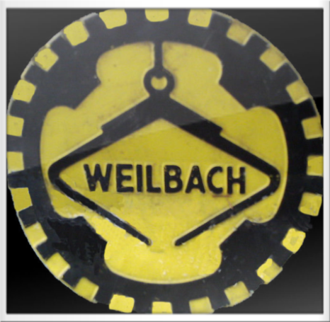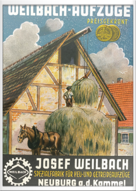 Blech-Reklame Schild der Firma Weilbach aus Neuburg an der Kammel für Greiferaufzüge