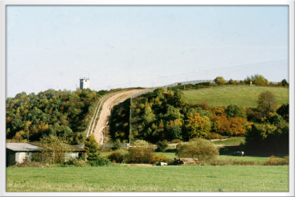 Blick von der Kreisstrasse K4 auf das Pfaffental und die Grenzbefestigungen der Grenztruppen der DDR, hinter dem Metallgitterzaum der Kolonnenweg und der Beobachtungsturm im Sommer 1989