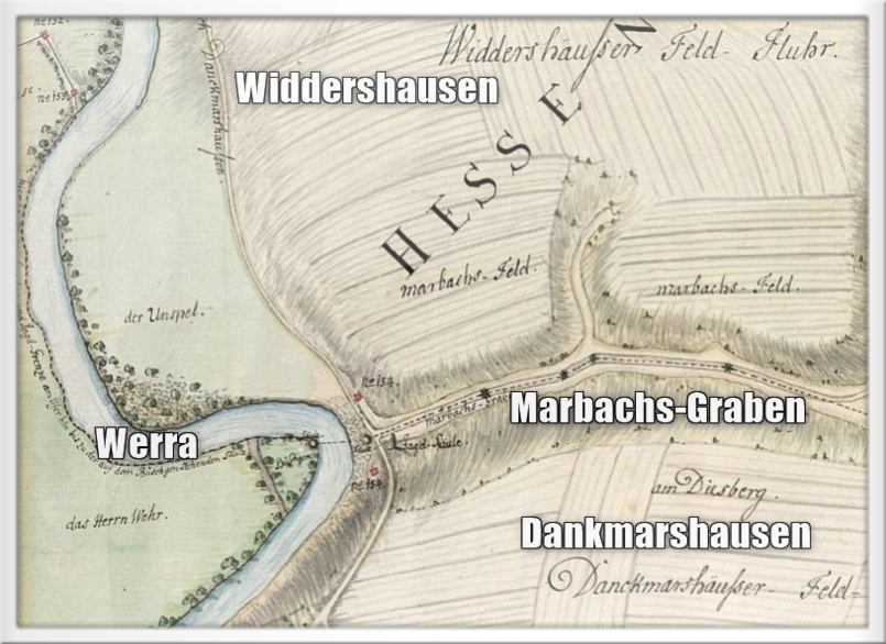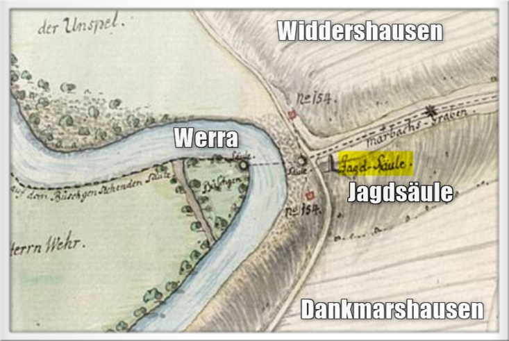 Jagdsäulen zwischen Widdershausen und Dankmarshausen, die im Jahre 1739 wieder aufgerichtet wurden. Die Säulen wurden 1694 von Hessen u. Sachsen-Eisenach gemeinsam gesetzt.