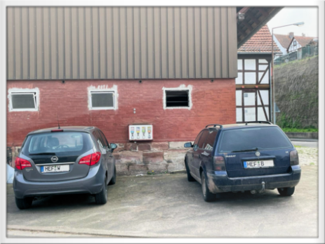 Der Kaugummi-Automat mit vier Auswahlmöglichkeiten in einem aufbruchsicherem Stahlkorsett an der Stallwand der Familie Österreicher in der Brückengasse in Widdershausen