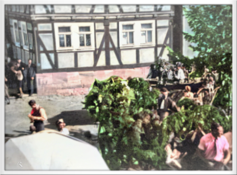 Kirmesgesellschaft in den 1950er Jahren in Widdershausen unter der Dorflinde, hier wurde in dieser Zeit Kirmes-Sonntag auch zum Tanz aufgespielt.