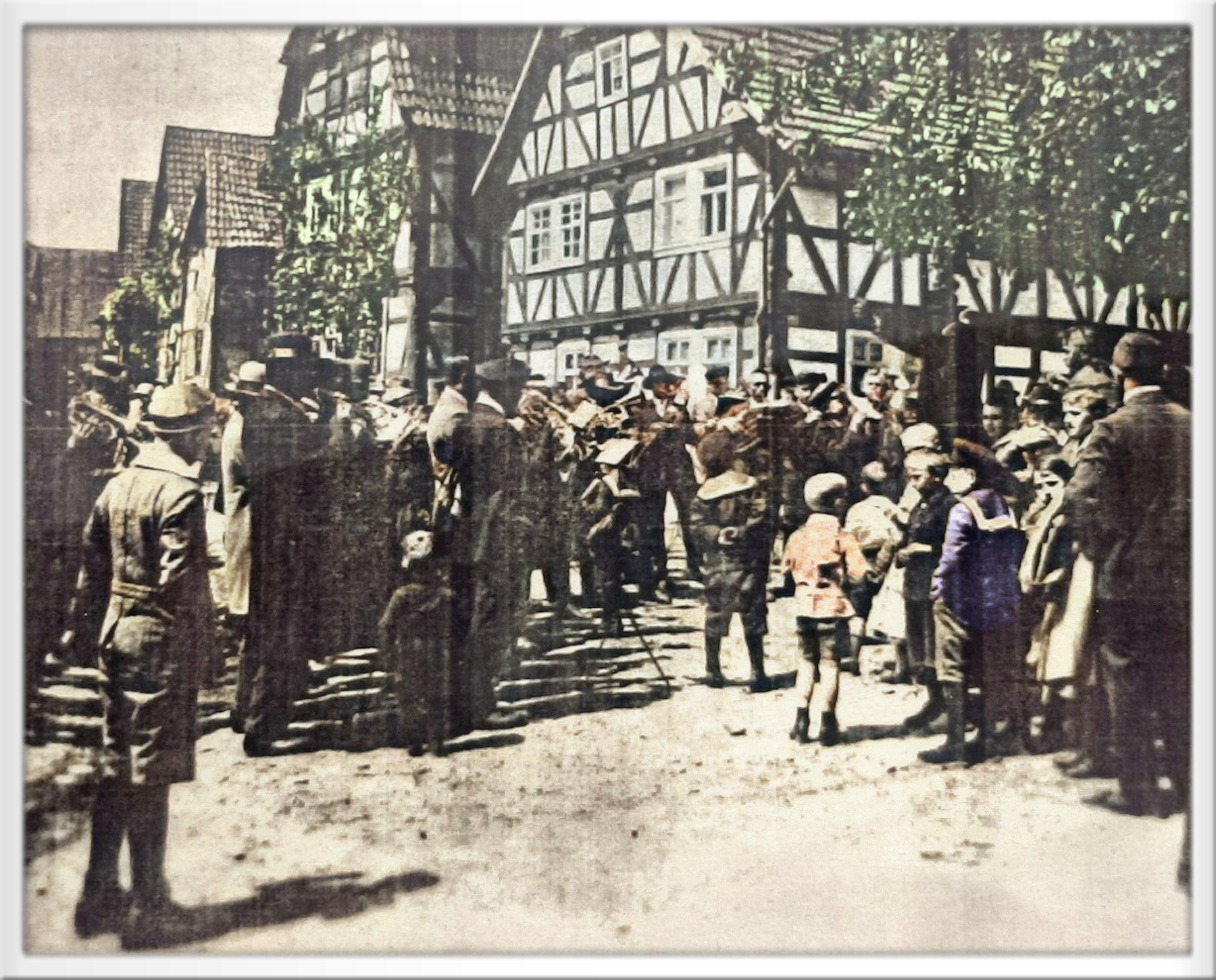 Musikkapelle vor der alten Linde in der Dorfmitte Widdershausen um 1920
