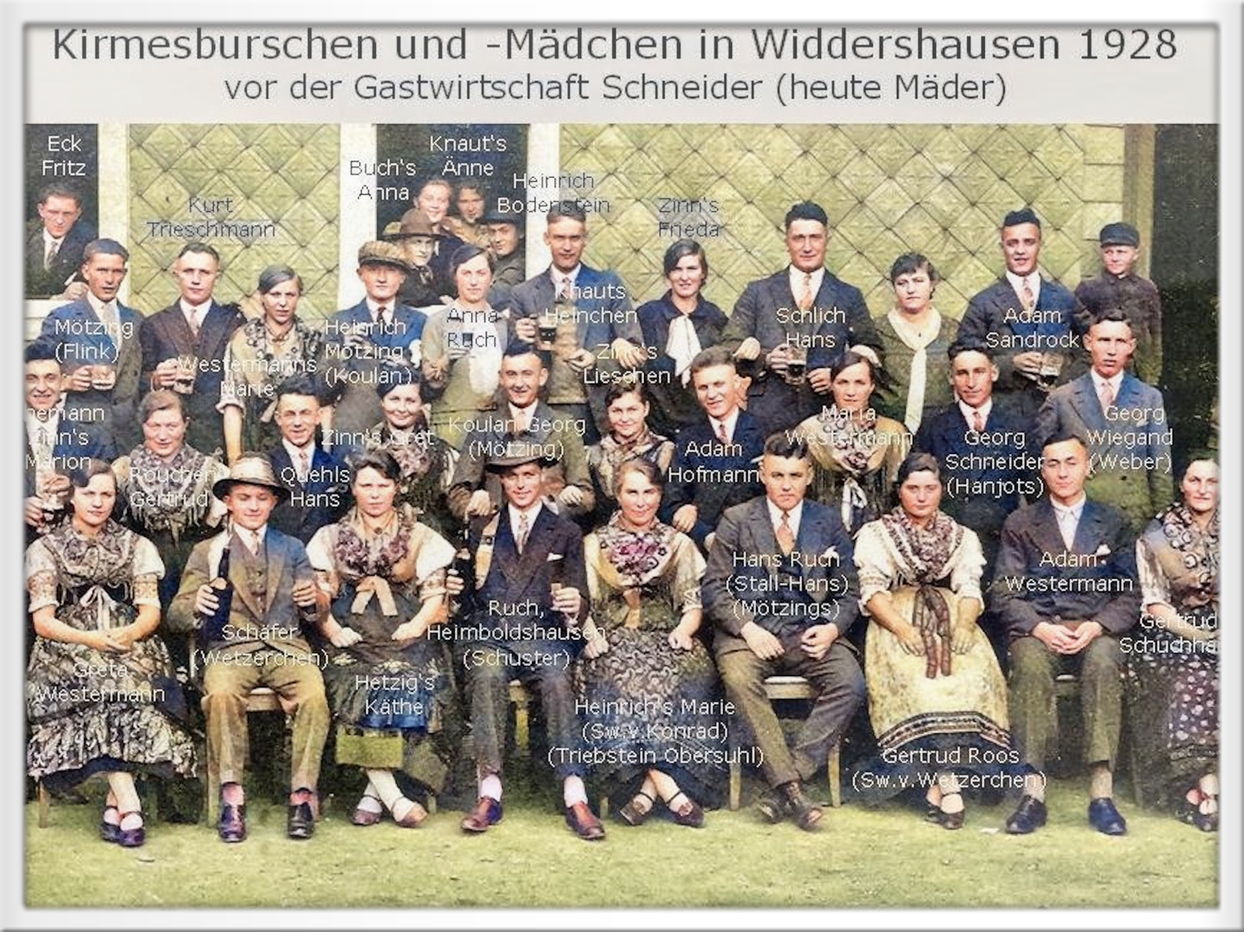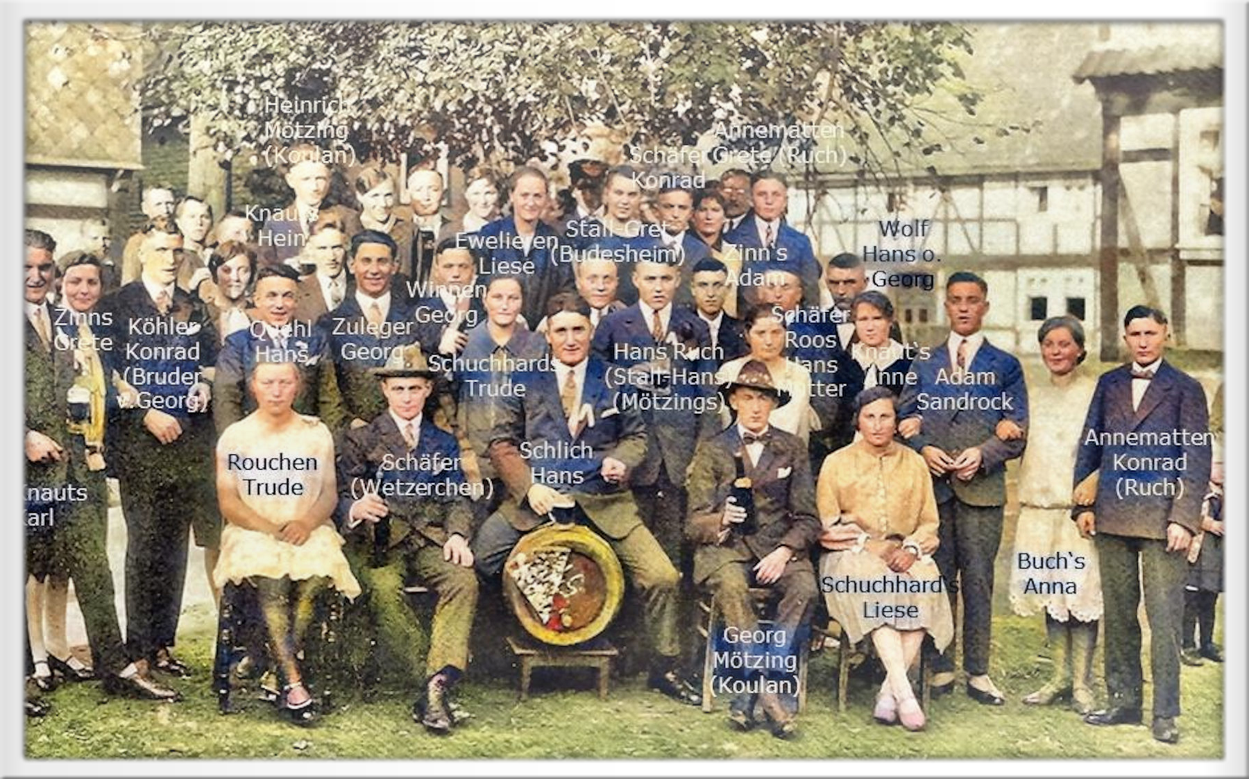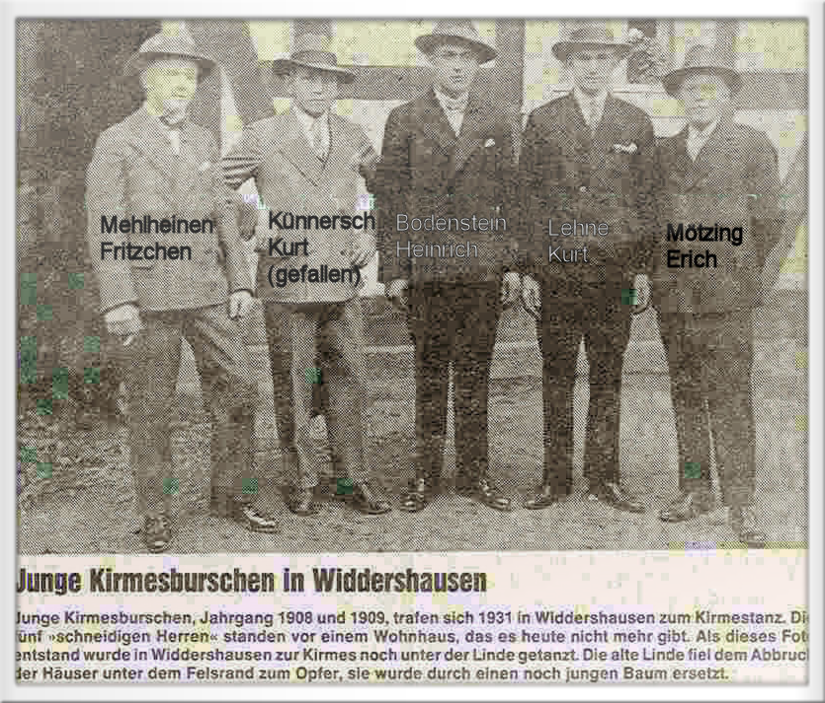 Kirmesgesellschaft 1928 in Widdershausen unter der Dorflinde, hier wurde in dieser Zeit Kirmes-Sonntag auch zum Tanz aufgespielt.