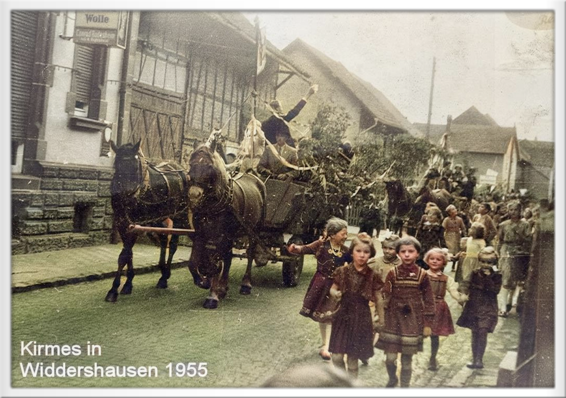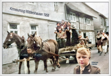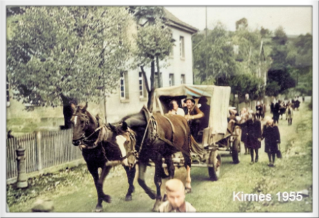 Kirmesumzug 1955, Pferdegespann von Heinrich Koch, an den Zügeln Kurt Haas ("Hoaren Kärtchen"), rechts im Vordergrund Werner Heidel