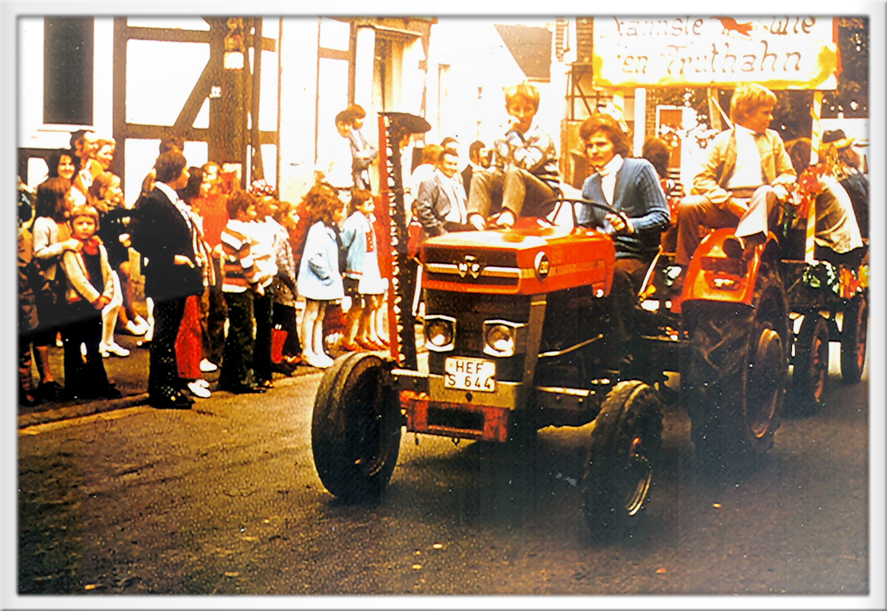 Kirmes Widdershausen 1976 - Kirmeswagen mit heiklem Motto, am Lenker Bernd Koch, Beifahrer: Harald Rimbach und Jörg Schneider
