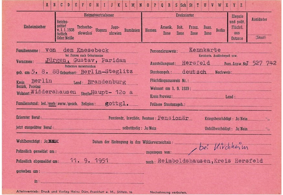 Jürgen von dem Knesebeck und seine Frau Gina haben Widdershausen am 11.09.1951 verlassen und haben sich nach Reimboldshausen bei Kirchheim abgemeldet.