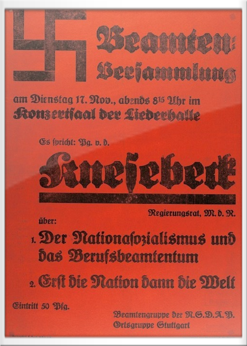Plakat der NASAP zu einer Beamtenversammlung vom 17.11.1931 in Stuttgart, Redner: Jürgen von dem Knesebeck; Punkt 2 des Versammlungsthemas erinnert sehr stark an "America First" des amtierenden amerikanischen Präsidenten