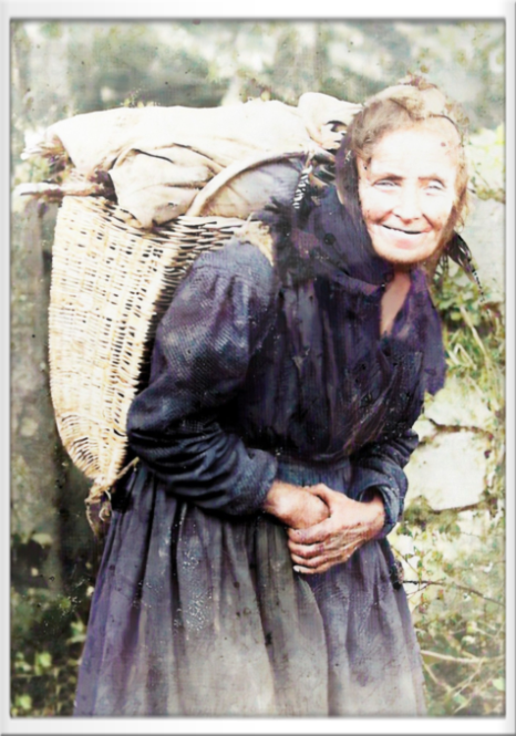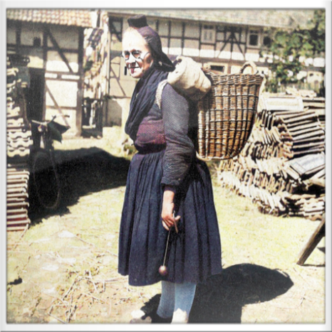 Dieses Bild zeigt eine ältere, arme Frau aus Hattenbach um 1910, sie trägt eine Kötze, deren Inhalt mit einem Tuch oder Sack abgedeckt ist.