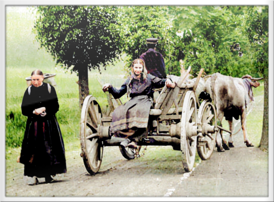 Frau mit Kötze begegnet einem Kuhgespann auf einer Landstrasse