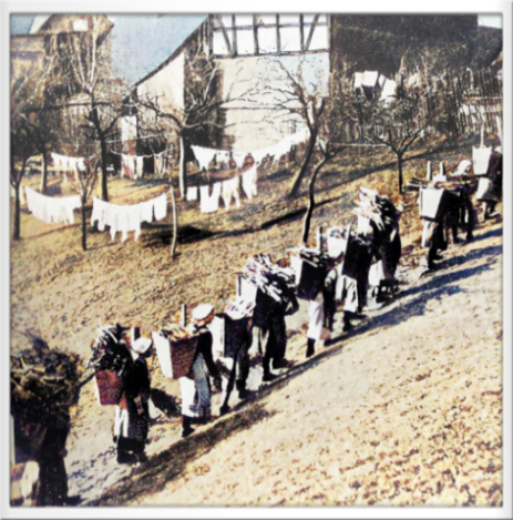 Eine größere Gruppe von Landfrauen mit einer Kötze auf dem Rücken, kommen beladen mit Reisigholz zurück in ihr Dorf