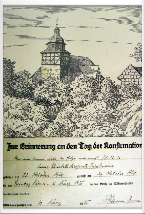Eine Konfirmationsurkunde aus dem Jahre 1935 für Elisabeth Trieschmann aus Widdershausen von Pfarrer Wilhelm Baum