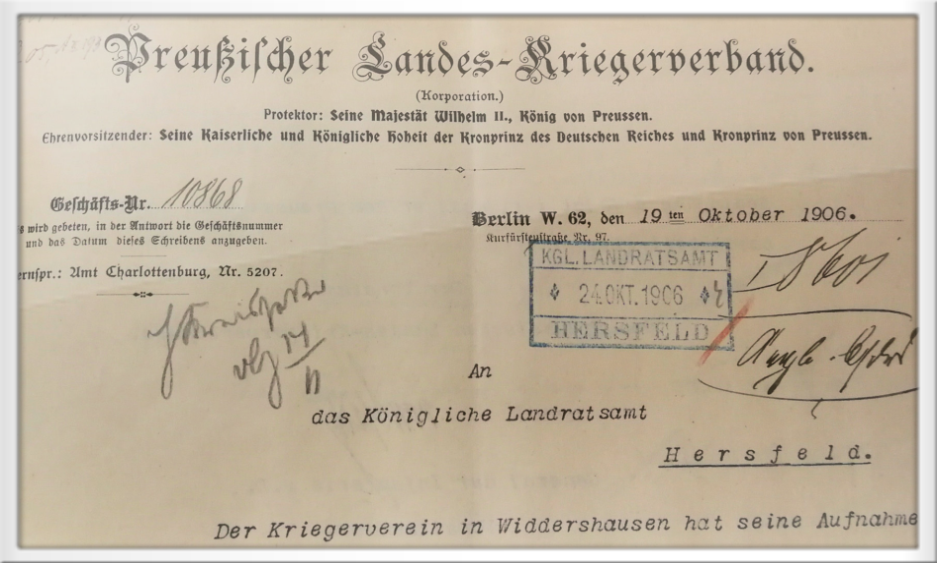 Briefkopf des Preussischen Landes-Kriegerverbandes zur Aufnahme des Kriegervereins Widdershausen