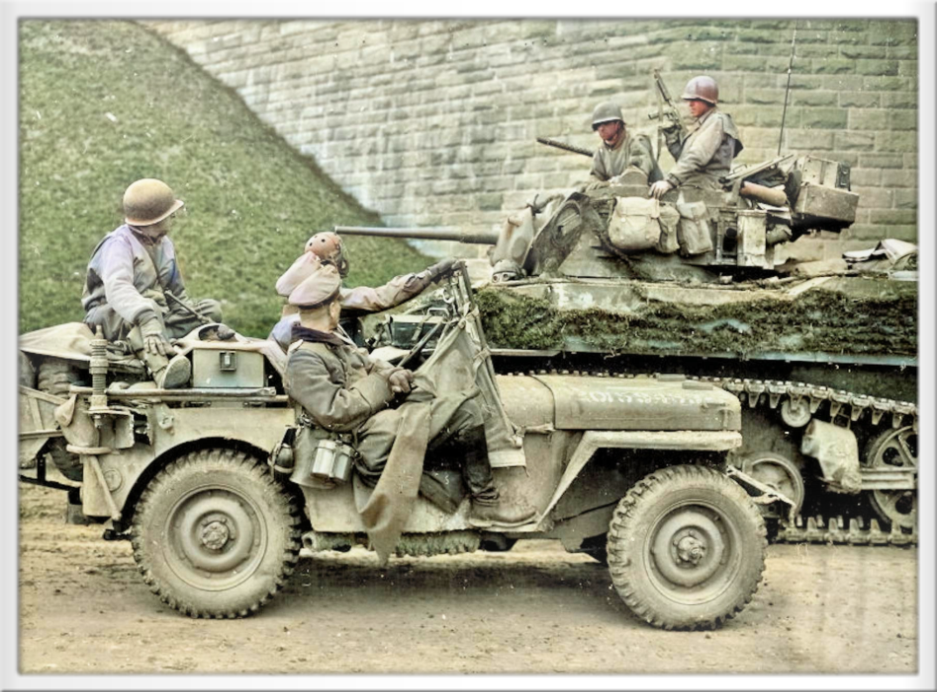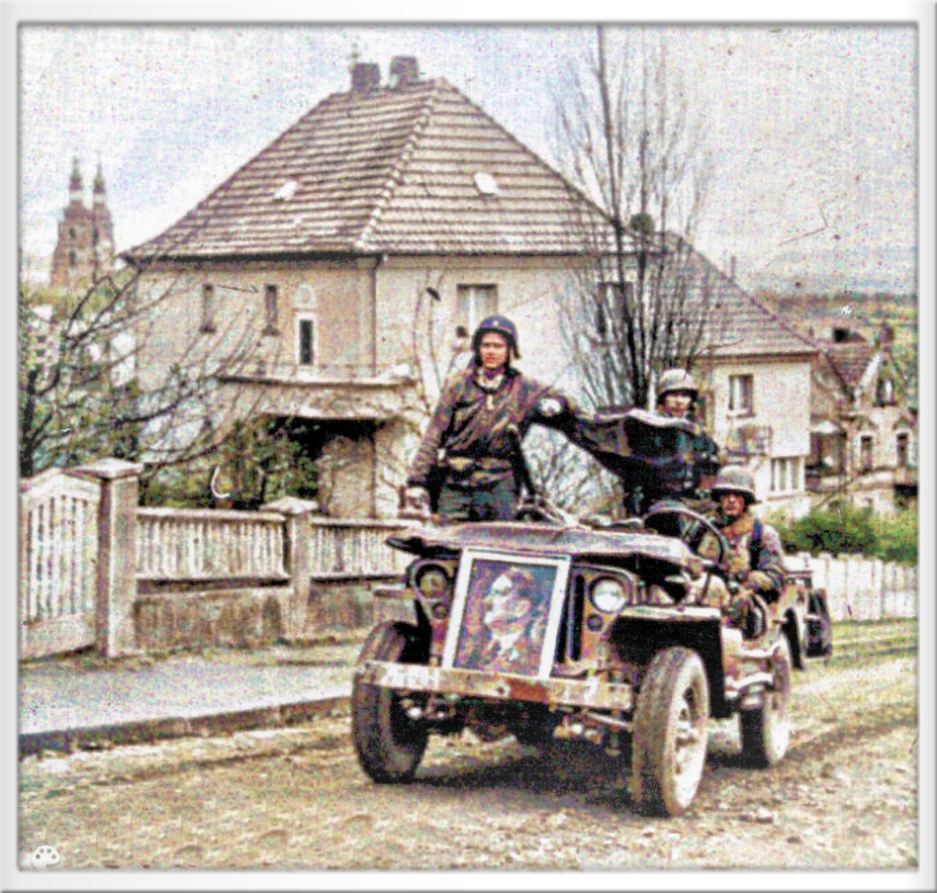 Jeep der ameik. 4. Pz. Div. am 31.03.1945 an der Hersfelder Autobahnbrücke mit Major Damm und Major Georg August Möller, die die Amerikaner in die unbesetzte Stadt führten