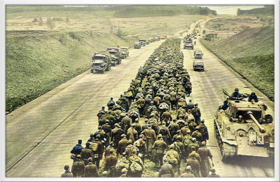 Deutsche Kriegsgefangene Ende März 1945 auf der Autobahn bei Giessen