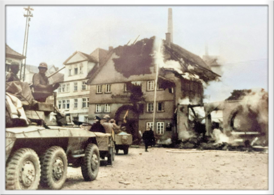 Pz.Spähwagen der amerikanischen 4. PzDiv. auf der Fahrt zum Rathaus zu Übergabeverhandlungen am 31.03.1945 in Hersfeld vor dem Gasthaus Adler und dem niederbebrannten Saufhaus am Brink