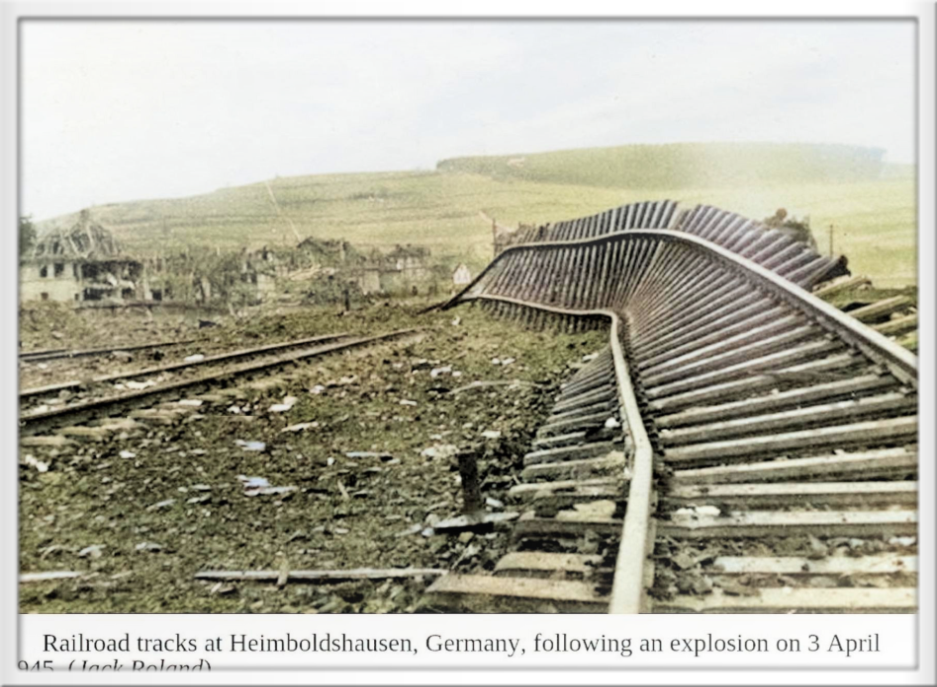 Am 3. April 1945 um 18:30 Uhr griff ein deutscher Jäger die US-Truppen in Heimboldshausen an. Die Maschine wurde von der Flugabwehr getroffen und lud seine Bomben am Heimboldshäuser Bahnhof direkt über der A-Kompanie der 712th Tank Battalion und den CPs der 358th ab. Eine Bombe traf einen Güterwagen mit Schwarzpulver, und die sich daraus ergebende Explosion ließ einen 50-Fuß-Krater entstehen, zerstörte 5 Häuser, sprengte die Dächer von 30 anderen und brach alle Fenster in der Nähe des Bahnhofes.