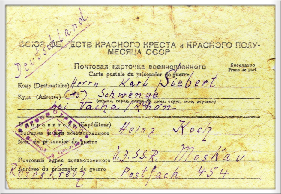 Hans Hoßfeld wurde wegen Krankheit früher aus der Kriegsgefangenschaft entlassen und konnte so ein Lebenszeichen und das Lager mit Anschrift an die Schwester von Heinrich Koch übermitteln.