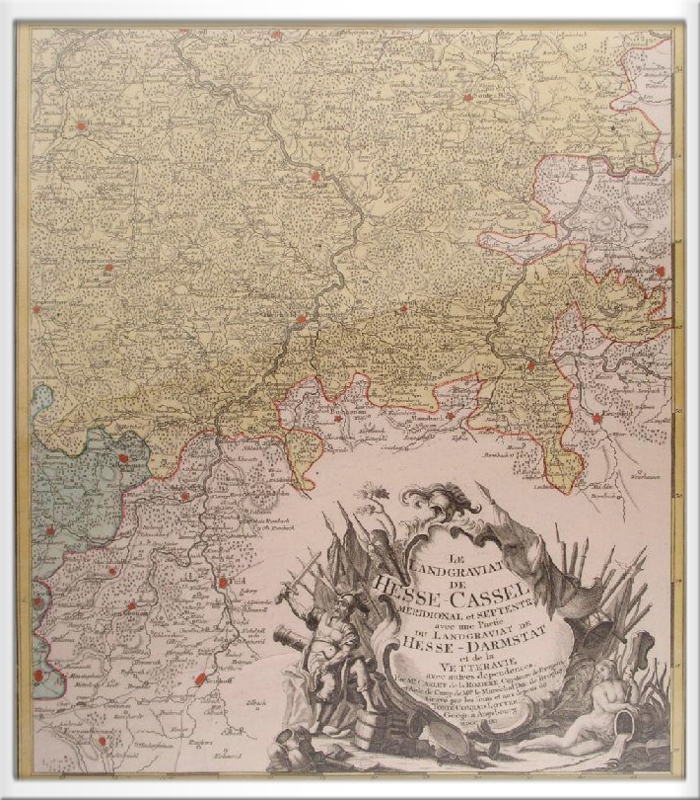 "Le Landgraviat de Hesse-Cassel meridional et septentr[ional] avec une partie du Landgraviat de Hesse-Darmstat et de la Vetteravie" [LANDGRAFSCHAFT HESSEN-KASSEL, mit angrenzenden Gebieten Oberhessen (Hessen-Darmstadt) und der Wetterau; Kriegsschauplatz Siebenjähriger Krieg; Abschnitt Wetzlar - Werra, Lippstadt - Nidda. Tobias Conrad Lotter (Verfasser). Carlet de la Roziére (Dragonerhauptmann und Adjutant von Marschall Broglie, Verfasser der Vorläuferkarte und Auftraggeber). Stiche, handkoloriert (Territorialgrenzen mehrfarbig, Städte rot, Truppenteile z. T. violett und gelb, Windrose blau-rot). 1 : 140.000. Augsburg. Verschieden gefaltet, ca. 53 x 50 cm (58 x 70 cm); thematisch-topographische Karten mit Einzeichnungen des Straßennetzes und des Feldzuges von 1759/60; Großkarte oder vierteiliger Kartensatz; Militärkarte (Kopie der Landkarte des Landgrafen von Hessen-Kassel). Bem.: Maßstab in deutschen und hessischen (Kasseler?) Meilen; Gradeinteilung am Rand; Titel und Legende mit allegorischer Umrahmung (Titel: Muschelornament mit Kriegswerkzeug; Legende: Blattornament); Einzeichnungen von Festungen in alter und neuer (Vauban) Bauweise und von Holz- und Steinbrücken; Bezeichnung der Truppenteile bzw. französischen Armeen mit Buchstaben A-D.
