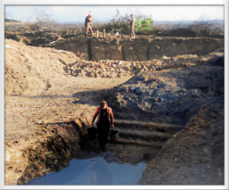 Blick in eine Lehmgrube, im Vordergrund holt ein Arbeiter Wasser aus der Lehmkuhle und bringt es zu den beiden Männern im Hintergrund, die Holzpfähle in eine Lehmwand einschlagen, das Wasser wird in diesen Bereich gegossen um später die Lehmwand abzuschlagen.