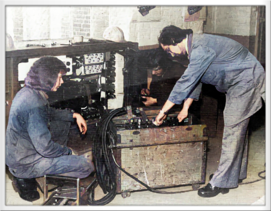 Ausbildungsingenieur Bernd Trieschmann überprüft die von den Auszubildenden Jürgen Wehner (1958-2020) und Ralf Wolf ausgeführten Installationen einer kompletten Trafostation für den Grubenbetrieb