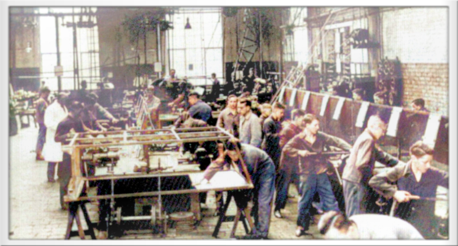 Blick in die große Halle der Lehrwerkstatt. Rechts im Bild das erste Lehrjahr beim Grundlehrgang für Metallberufe, ca. 1950