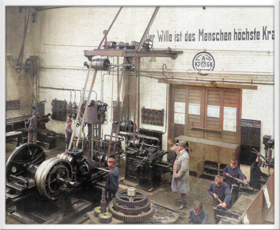 Start der Lehrlingsausbildung im Kaliwerk Wintershall 1928: Der Meister und seine Lehrlinge. Links eine mächtige Zahnrad-Fräsmaschine. Typisch für die Zeit ist der Transmissions-Antrieb und das mächtige Schwungrad.
