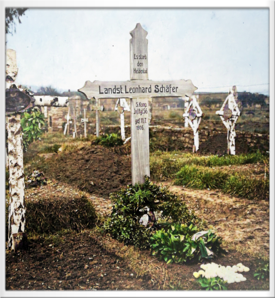 Grab von Landsturmmann Leonhard Schäfer auf dem Behelfsfriedhof von Sivry-sur-Meuse im Juli 1916 bei Verdun. Das Grab wurde 1920 umgebettet nach Consenvoye.