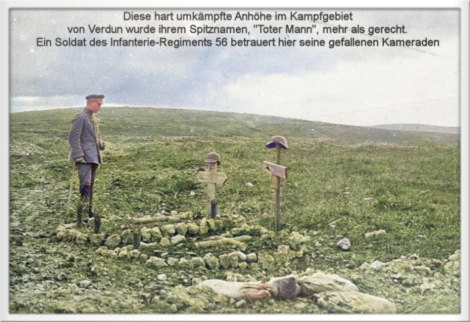 Diese hart umkämpfte Anhöhe im Kampfgebiet von Verdun wurde ihrem Spitznamen, toter Mann, mehr als gerecht. Ein Soldat des Infanterie-Regiments 56 betrauert hier seine gefallenen Kameraden.