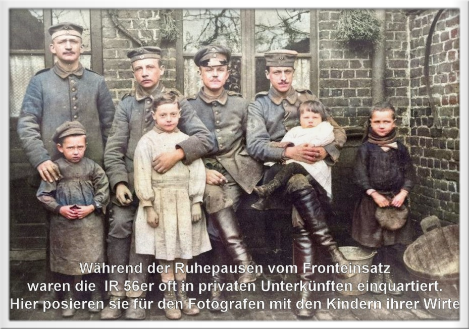 Während der Ruhepausen vom Fronteinsatz waren die IR 56er oft in privaten Unterkünften einquartiert. Hier posieren sie für den Fotografen mit den Kindern ihrer Wirte.