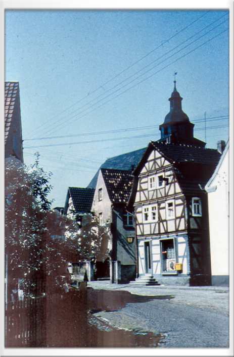 Der Dorfplatz in der Mitte des alten Kerndorfes von Widdershausen mit der alten Linde im Jahr 1973, eine Frau wartet auf den Linienbus und Vadder (Karl-Heinz Wagner 1939-2017) geht nach der Mittagspause wieder zur Raiffeisenkasse